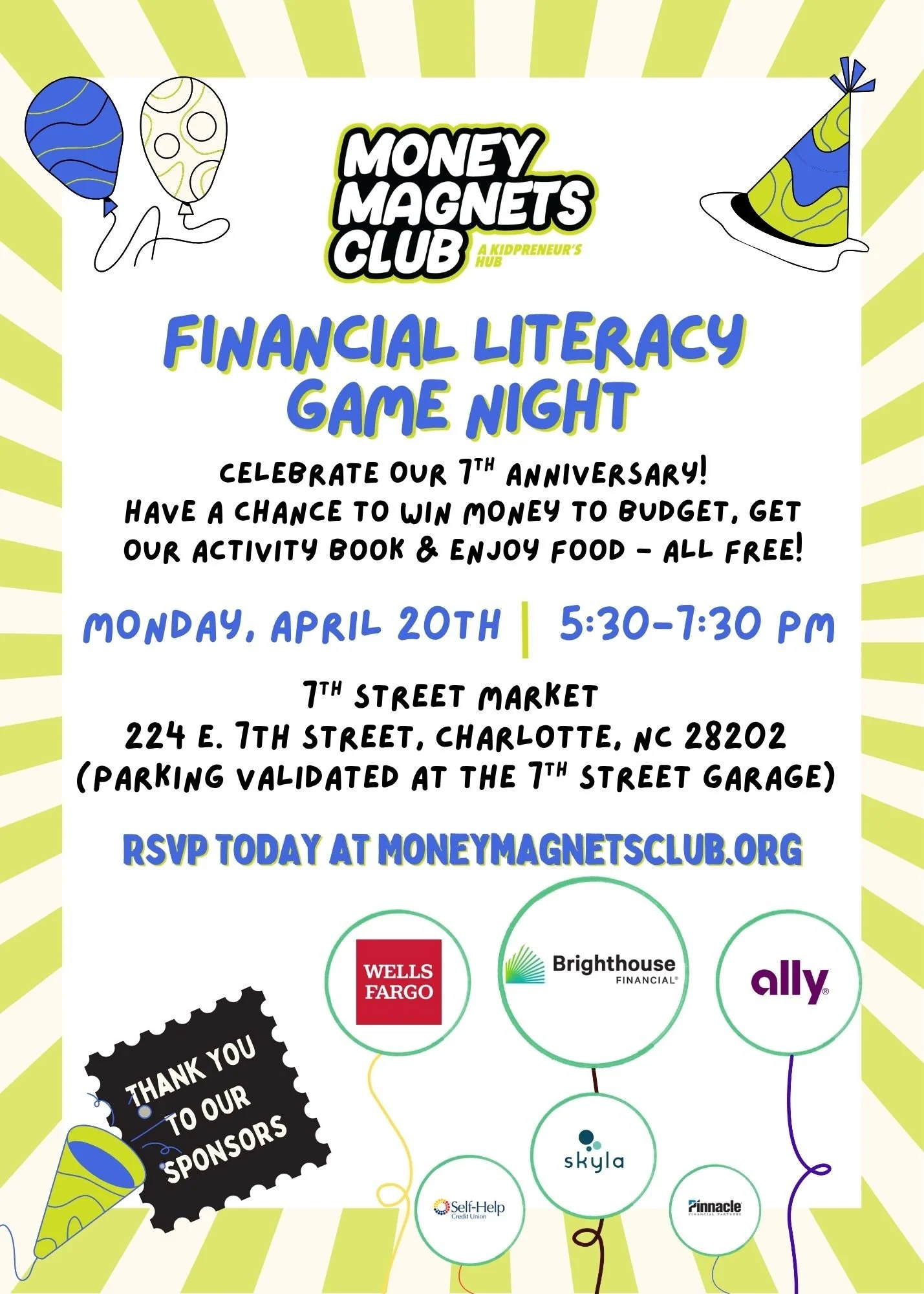 Attendees will be able to enjoy dinner from 7th street market vendors, play some fun financial literacy games and have a chance to win money to budget, get a copy of our activity book, thanks to our friends at Ally, and enjoy time further financial health for all ages!